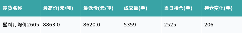 南财智讯3月26日电,盘后期货数据显示,大连商品交易所的塑料主力合约收涨1.01%,收盘报8767.0元/吨,日内资金流入213.97万元。其他相关指标见下表: