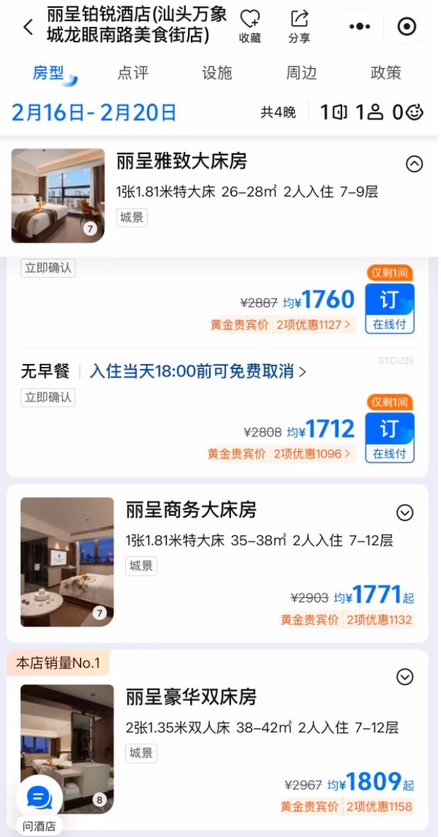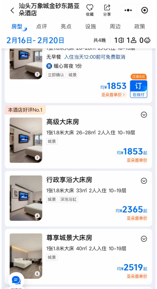 不过,当地酒店春节期间每晚价格仍高于春节假期过后的价格,目前价格上涨幅度大多为2倍至6倍。例如,一距离汕头市中心约1公里的连锁酒店,同等普通房型的情况下,春节假期每晚费用达到1000元左右,而在2月24日价格约为每晚260元。部分豪华型酒店的套房价格则在6800元左右,较春节假期过后的同类型套房价格上涨1000至2000元每晚。